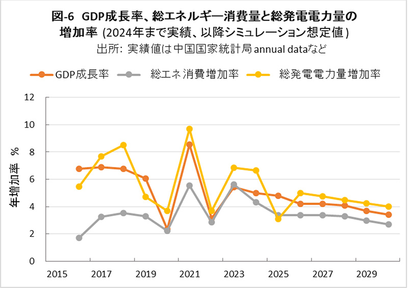 CO2の増加要因である総エネルギー消費量は、具体的には次のように想定しました。図-6に、GDP成長率に対する総エネルギー消費量と総発電電力量の増加率を示しました。2024年までは実績値、それ以降はシミュレーションの基本ケースで用いた値です。