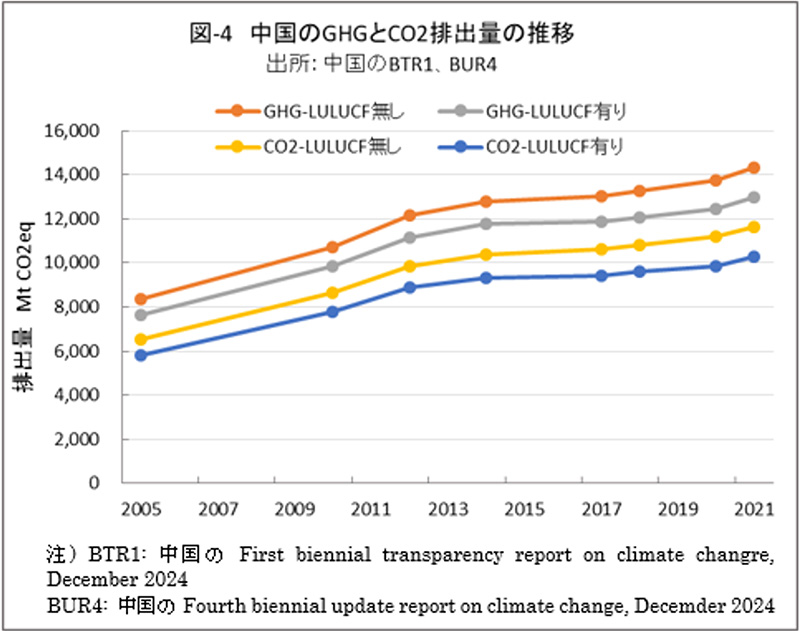 図-4に、中国が公式に報告しているGHGとCO2の排出量の推移を、LULUCF考慮の有無両者について示しました。なお、2005年は中国のGHG排出削減の基準年です。2005年に対する2021年の排出量の増加率は、LULUCFの有無に係わらずGHGは約1.7倍、CO2は約1.8倍です。