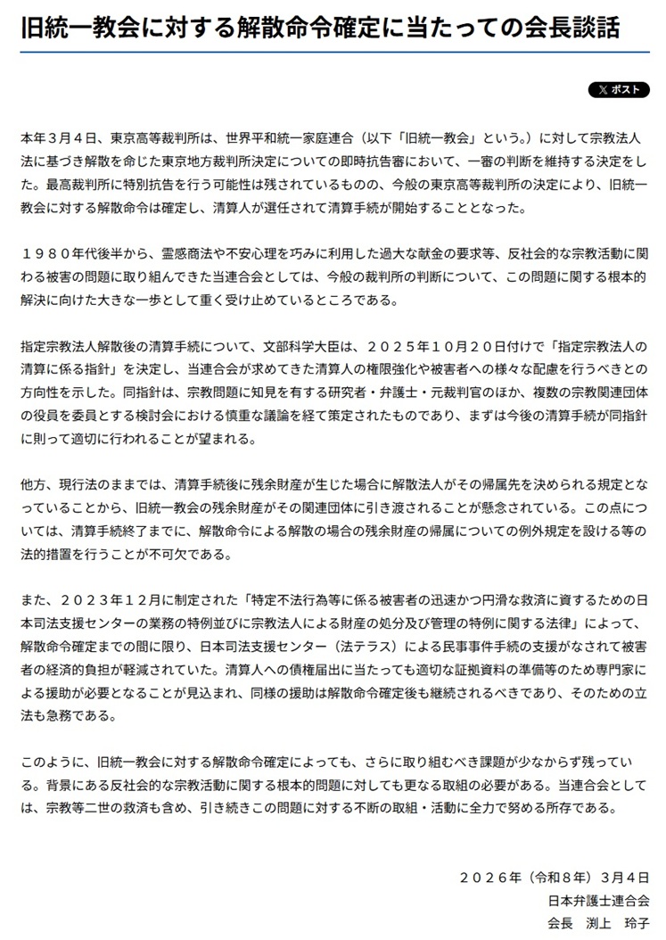 日本弁護士連合会:旧統一教会に対する解散命令確定に当たっての会長談話