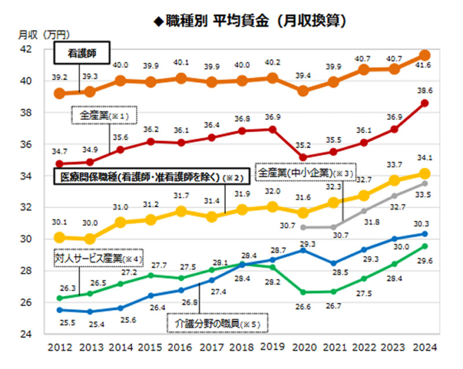 賃金データを見ると、病院看護師の平均年収は約519万円(令和6年、夜勤手当等含む)だが、クリニック・診療所勤務では374〜427万円程度に落ちる。この差の相当部分は夜勤手当(年42〜60万円相当)であり、夜勤のないクリニック勤務を同列に比べることはできない。