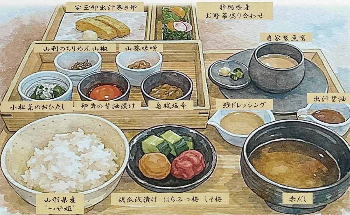 それに地元の干物の名店丸亀名産店の焼きたての鯖の塩干し、鰯やフグの醤油干しを合わせ、地元網代で獲れた飛び魚と宗田節から贅沢に取った出汁に京都山利の赤味噌のお味噌汁。