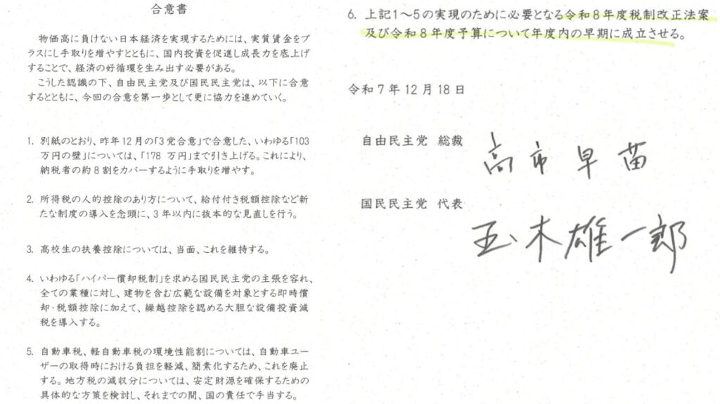- 12月18日に与党と合意をし覚書を交わし、高市内閣はこの合意内容を実行するために動くも予算の年度内成立に協力する約束を反故にする国民民主党