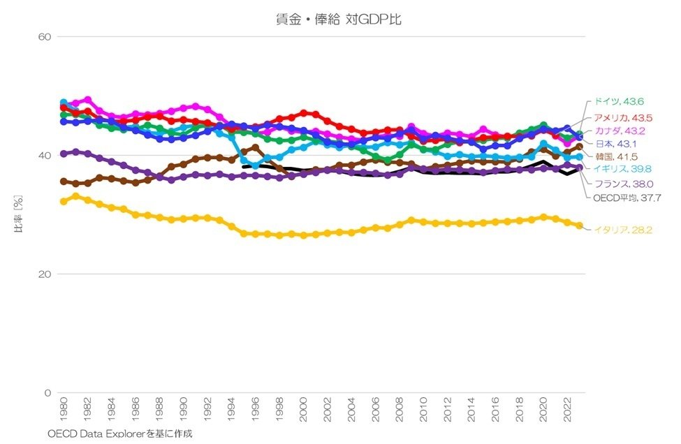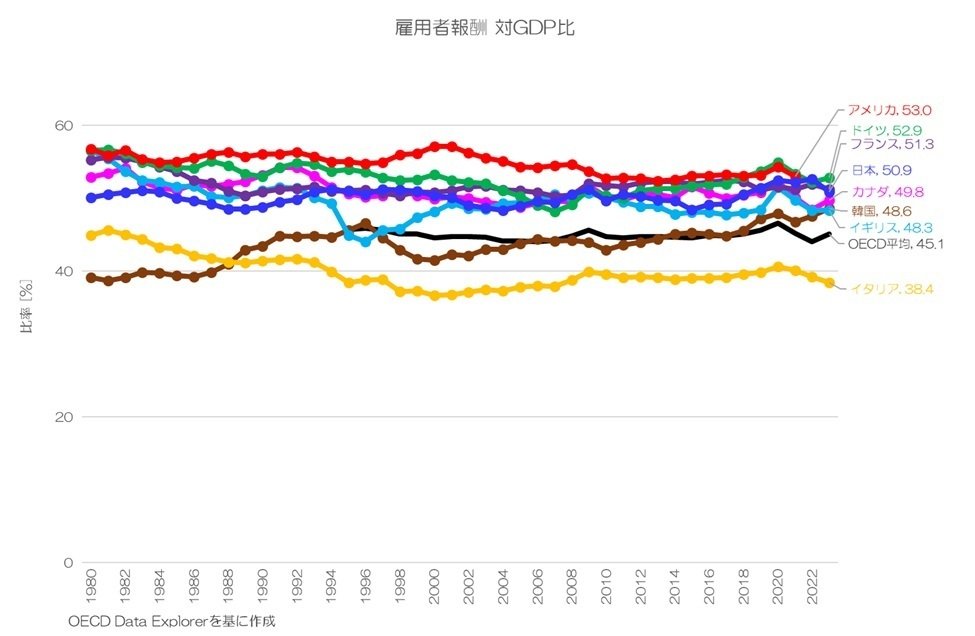 多くの主要先進国で、GDPの約50%は雇用者報酬として分配されている事になります。