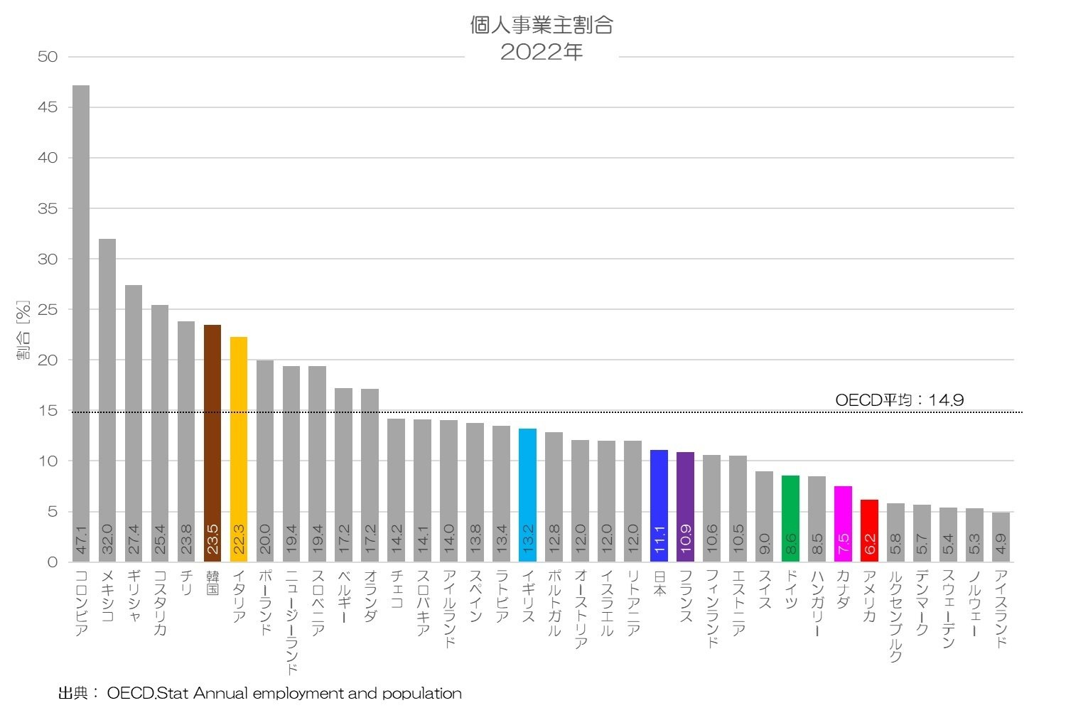 特に、個人事業主の多い国(イタリアなど)と少ない国(アメリカ、日本など)では大きく数値が乖離するはずですので、ご留意いただければ幸いです。