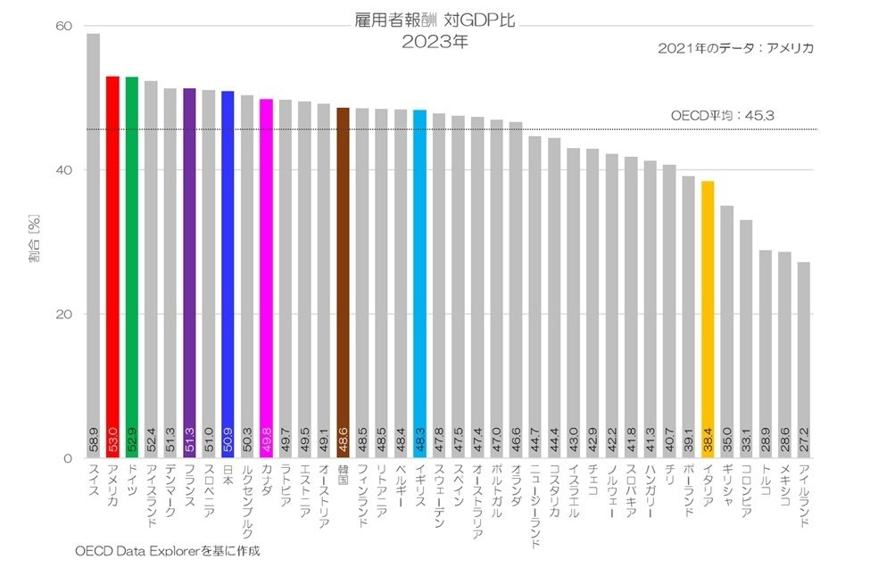 日本の雇用者報酬は対GDP比で見れば先進国の中でも多い方になります。