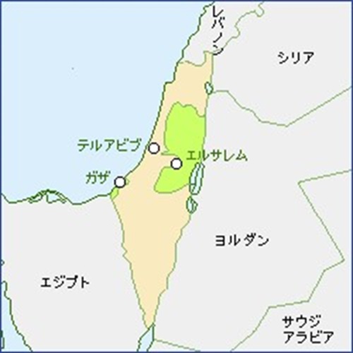 イスラエル(緑=パレスチナ自治区(ヨルダン川西岸及びガザ地区))外務省HPより