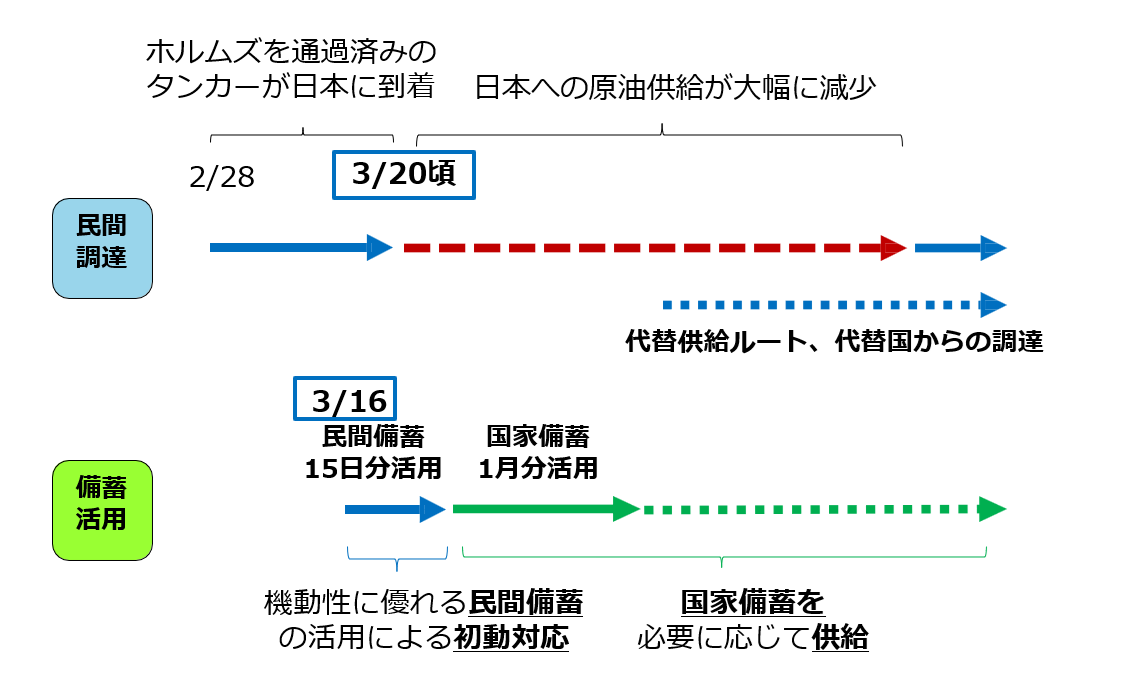 現在、日本には国家備蓄約146日分、民間備蓄約101日分、産油国共同備蓄約7日分と合計で約254日分の石油備蓄量があり、既に3月16日から必要に応じた放出が行われています。