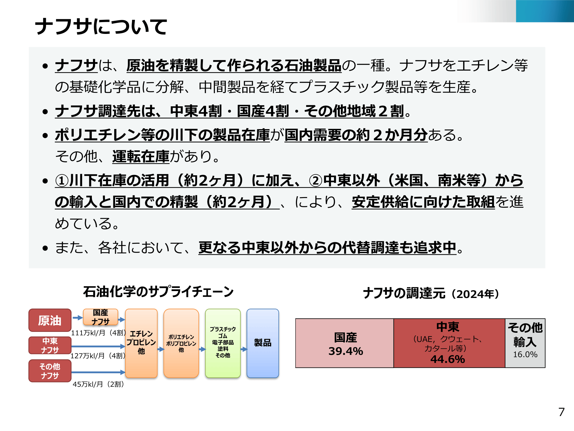 原油を精製してつくられるナフサも4割が中東からの輸入ですが、製品在庫は国内需要の約60日分あり、それに加え米国や南米などからの輸入と国内での精製で約60日分、合計で約120日分の備蓄があります。この間に安定供給に向けた取り組みを進めていきます。