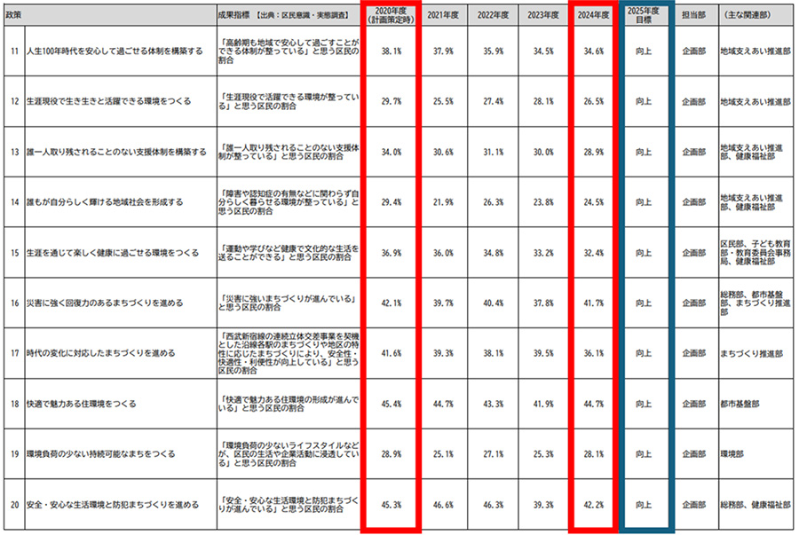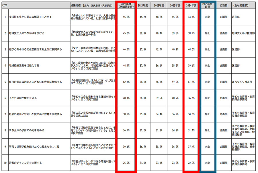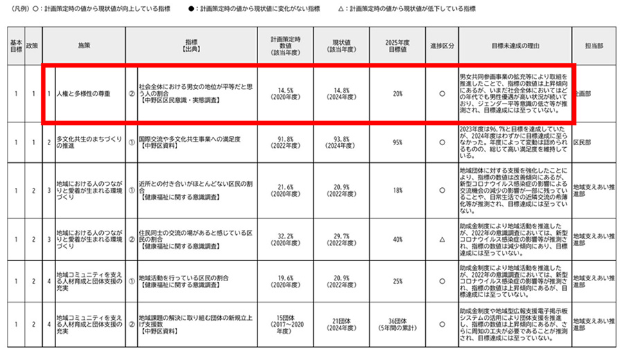 中野区の最上位計画「中野区基本計画(2021-2025年度)」の進捗状況(2024年度時点)を見ると、驚くべき実態が浮かび上がります。