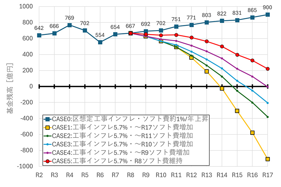 現在の財政運営には、不測の事態に対する弾力性が全くありません。物価高騰や工事インフレを考慮しない楽観的な財政試算(図の青線)に依拠していますが、現実的なインフレ率、過去の傾向をとらえたソフト事業費の増額を加味すれば、基金残高は急激に下降線をたどります。