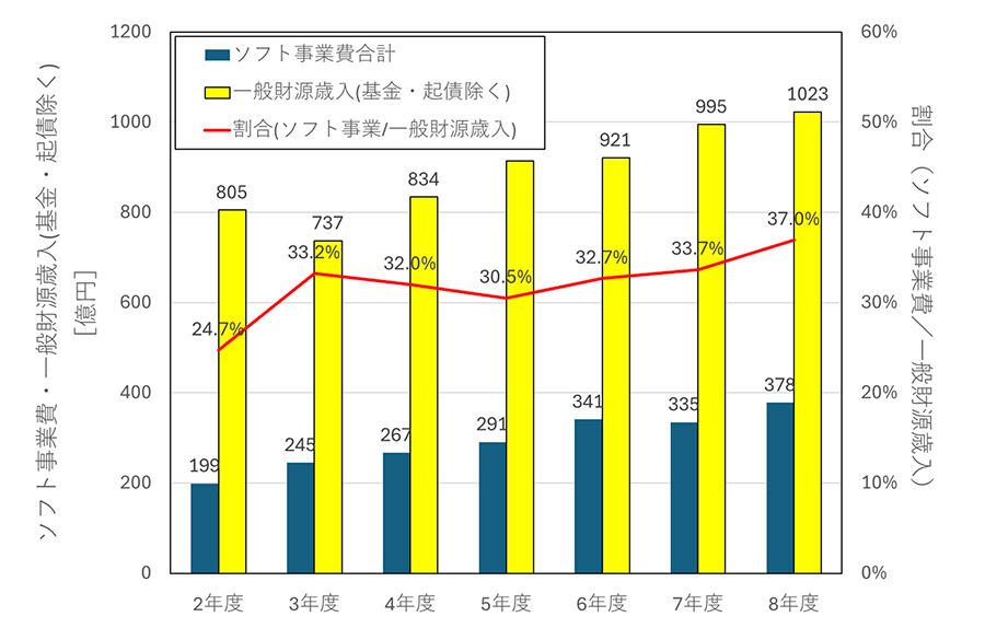 図2にソフト事業費と一般財源歳入の推移を示します。ソフト事業費は図1の数字を足し合わせたものです。