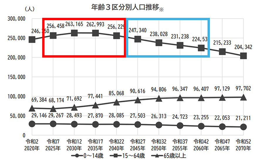図4 中野区の年齢3区分別人口推移(図3の前後半と同期間)