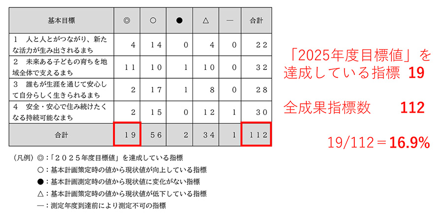 - 施策の成果指標(112指標・表2):達成率 16.9%