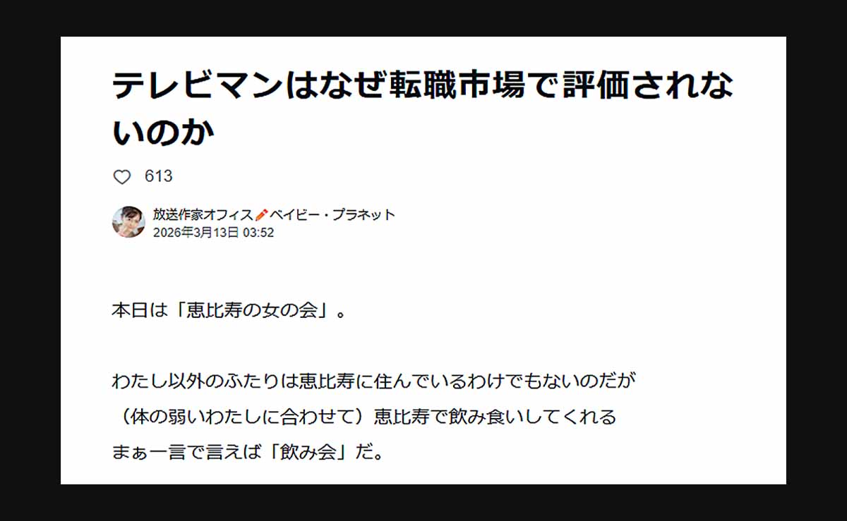 - 12日に公開されたnote記事は、テレビマンの転職市場での低評価に異議を唱え、「お宝人材」であると擁護する内容だったが、その論拠自体が抽象的で、評価基準として成立していないとの指摘が相次いだ