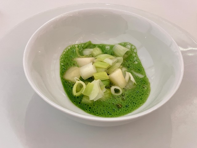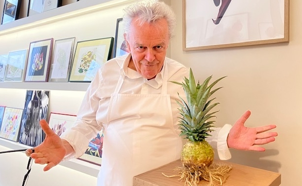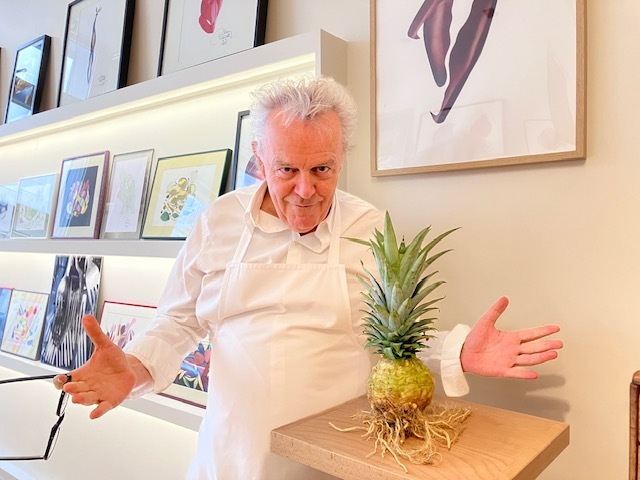 「ラルページュ(ラルページュ)」のアラン・パサールの新作”キメラ”は、パイナップルとセロリの組み合わせ。シンプルで不思議で美しいオブジェ。オブジェもいいけど、料理になったパイナップル&セロリも素晴らしい。