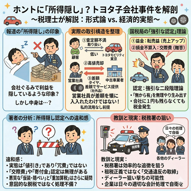 先日、トヨタ自動車の100%子会社「トヨタモビリティ東京」が、東京国税局から約4000万円の『所得隠し』を指摘されたというニュースがありました。