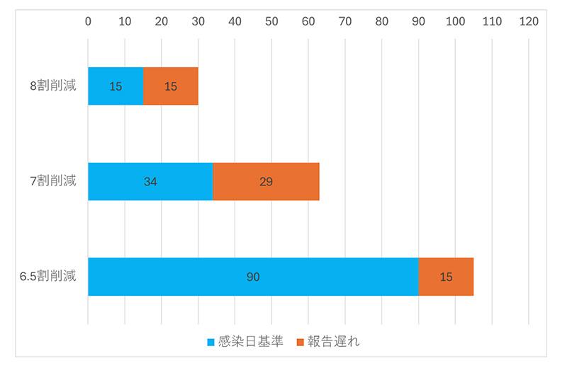 モデルは新規感染者の感染日を記述しているが、現実には感染日は観測できず、行政に報告された報告日別に新規感染者が数えられる。感染日から報告日まで15日間の遅れが生じるとされて、感染日ベースの新規感染者数が100人を切る日数に報告日までの遅れを加える形で確認されていた。