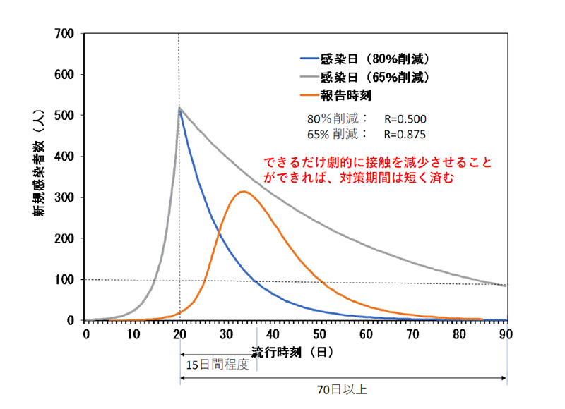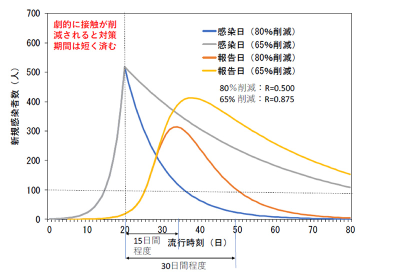 図1ではシミュレーション開始から20日目で接触削減が始まり、8割削減と6.5割削減の場合の新規感染者数を比較している。感染日と報告日の2つの数値があるが、感染日に着目しよう。何日で新規感染者数が100人まで低下するのかの計算では、「8割削減では15日かかる」とは、接触削減開始から数えて15日としている。