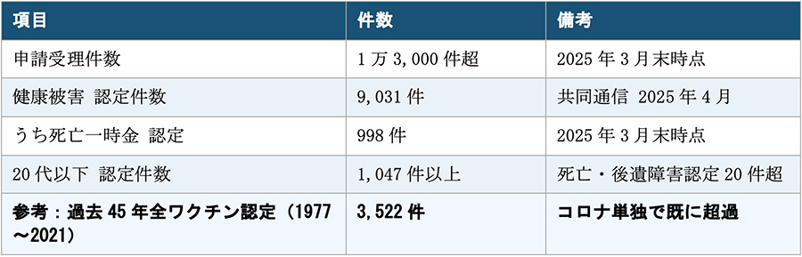 予防接種健康被害救済制度は2021年8月に審査開始。2025年3月末時点で受理1万3,000件超、うち9,031件が認定、死亡一時金認定は998件に上る(共同通信、2025年4月4日)。