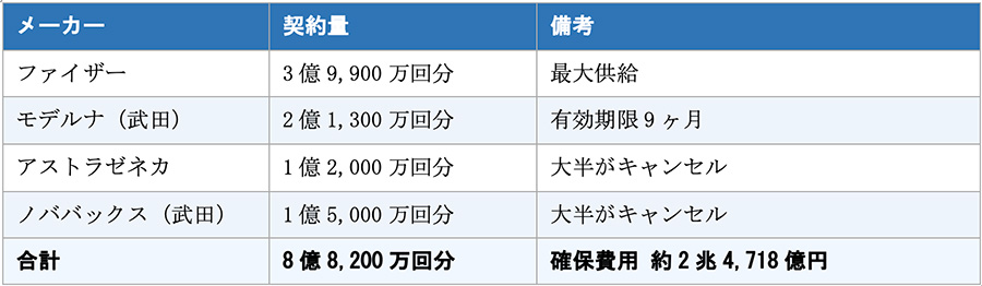 政府は4社と計8億8,200万回分・確保費用約2兆4,718億円の契約を結んだ(会計検査院、2023年3月)。