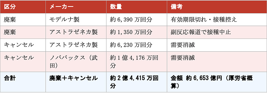 算定根拠について会計検査院は厚労省から十分な説明を得られなかった。廃棄・キャンセルは以下の通りだ。