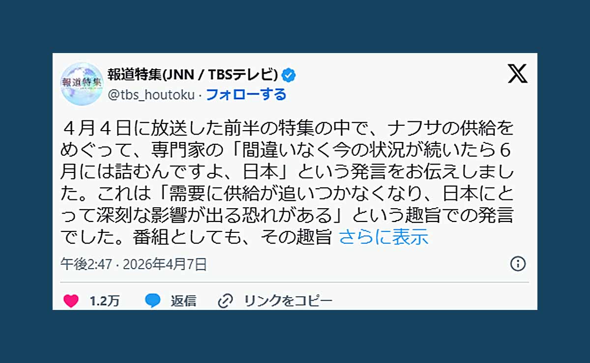 - 4月4日のTBS「報道特集」は、境野春彦氏の発言を「6月には詰む」と断言調で紹介し、日本のナフサ供給が近く破綻するかのような強い印象を与えた。