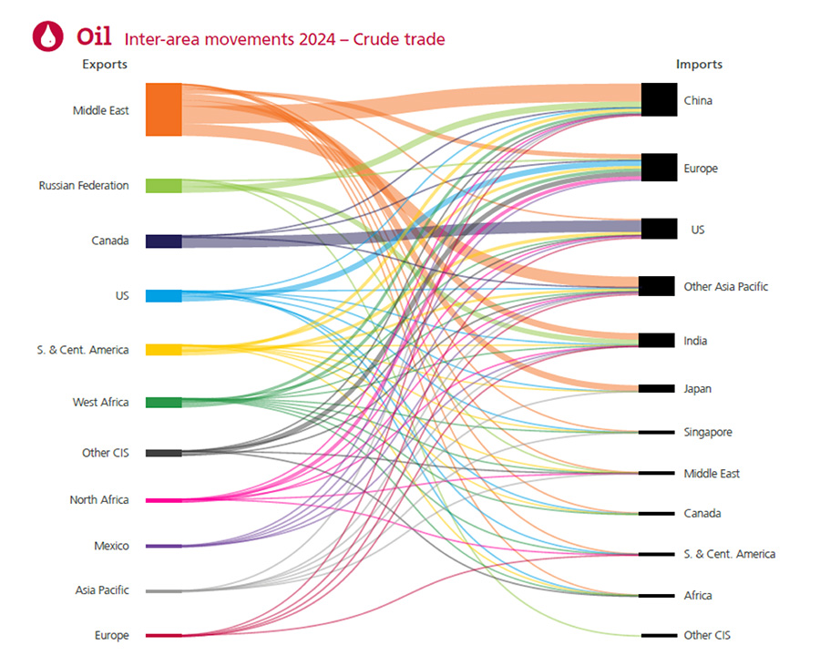 石油の中東依存度を示すエネルギーデータとしては、無料で公開されているEnergy InstituteのStatistical Review of World Energy 2025に、以下の図(2024年の地域間の石油の輸出入)がデータとともに示されている。