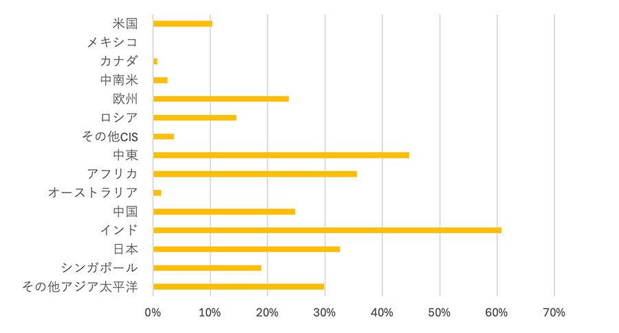 最近頻繁に報道されている通り、日本の原油の中東依存度は95%と、他の地域と比較して抜きんでて高いことを示している。また、その他アジア太平洋は70%、中国は60%弱、インドは50%弱と、アジア地域は全般的に原油輸入における中東依存度が他の地域に比べて高いことがわかる。