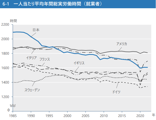 なぜかと言えば、長期的にほぼ一貫して、日本人の労働時間は減少し続けているからです。少なくとも「業務量が増えたから」というロジックは成立しませんね。
