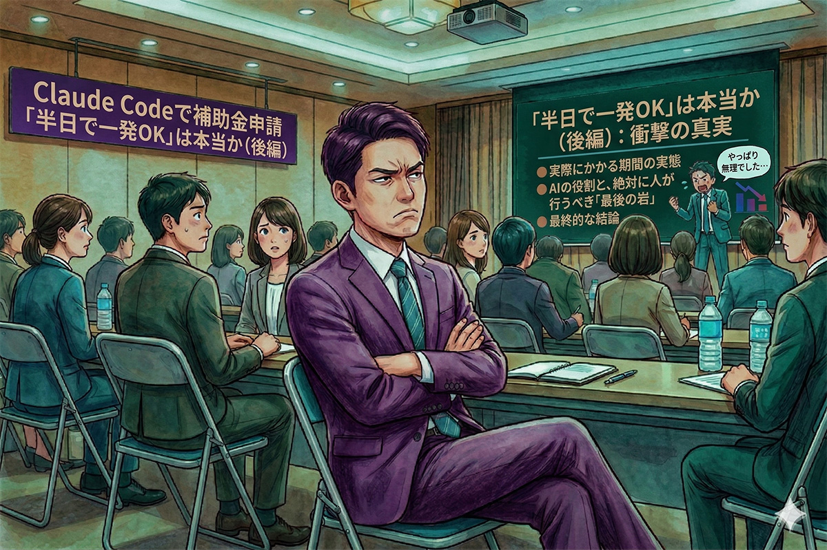 前編では、Xで話題になった「Claude Codeで補助金申請を半日で一発OK」という投稿を検証し、Claude Codeである必要がないこと、補助金の採択率、そして「一発OK」が採択ではなく様式4の発行に過ぎないことを指摘した。