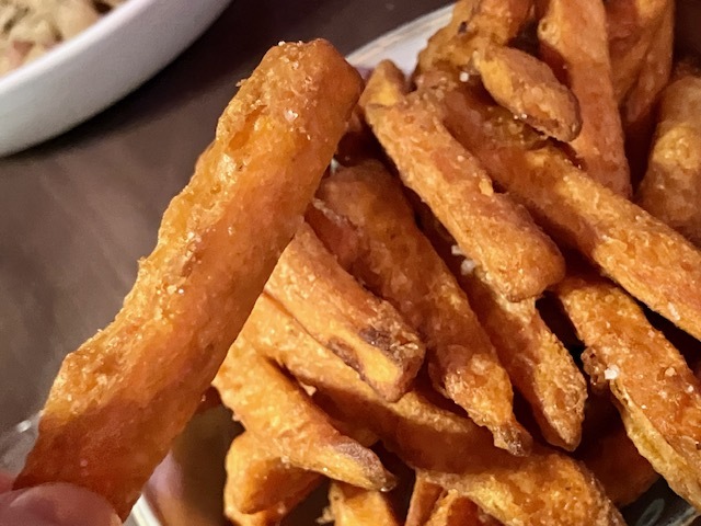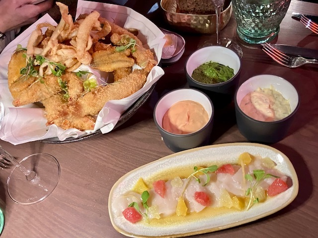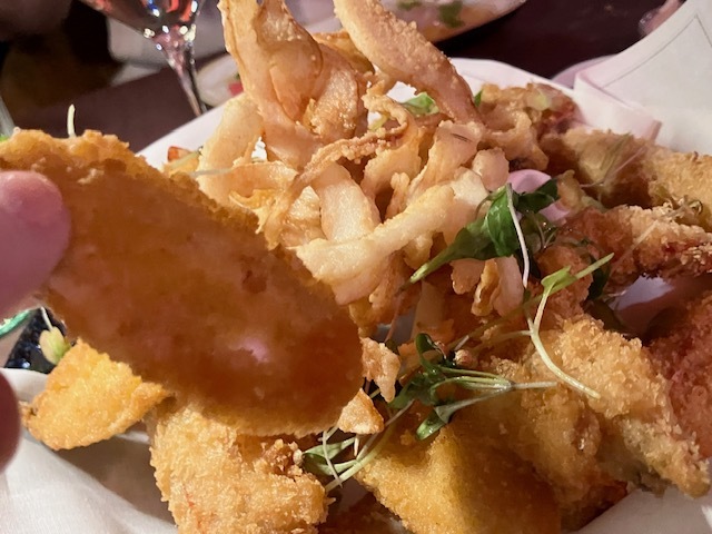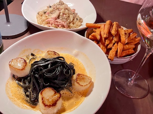 ホタテのカルパッチョ&柑橘カラメルヴィネグレット、魚介と野菜のフリットミスト。イカ墨リングイネ&ホタテポワレ、ミニパスタ&上質ハム&コンテ&秋トリュフ。付け合わせは甘くてカリッとほくっとさつまいものフリット。