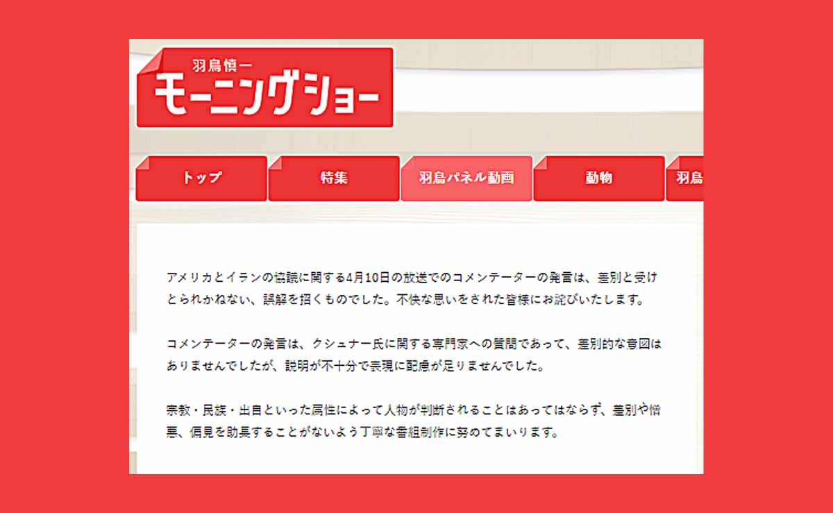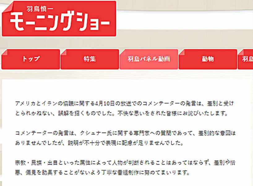 - テレビ朝日は4月15日、「羽鳥慎一モーニングショー」での発言について番組公式サイトで「差別と受けとられかねない、誤解を招くものだった」と謝罪したが、発言者である玉川徹の名前は明記されなかった