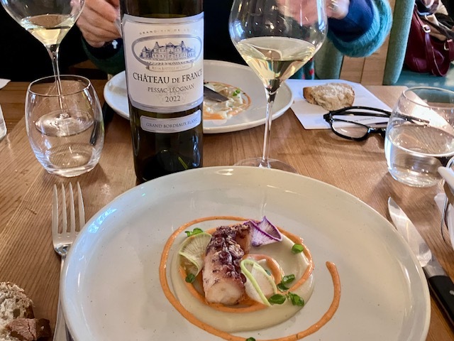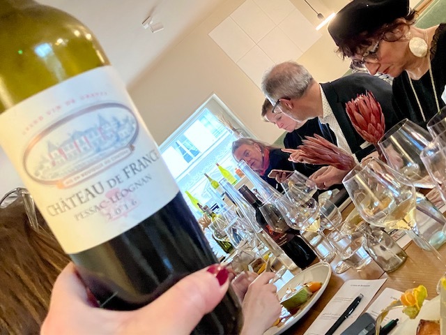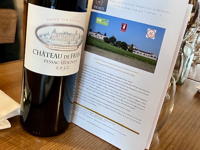 ボルドーはペサック・レオニャン地方の”シャトー・ド・フランス”、オーナーのアルノー・トマサンを囲んで、試飲会&ランチ。ペサックで最も古いシャトーの一つで、1996年から、ミシェル・ロランがコンサルタントについていて、コストパフォーマンス抜群のワイン作ってる。