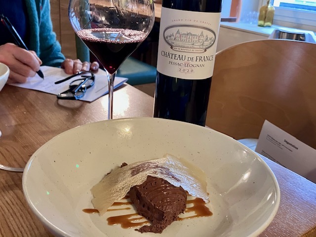 シャトー・ド・フランス赤20。明るく爽やかなイメージで、キャラメル風味のムースオショコラとちゃんと響きあう。