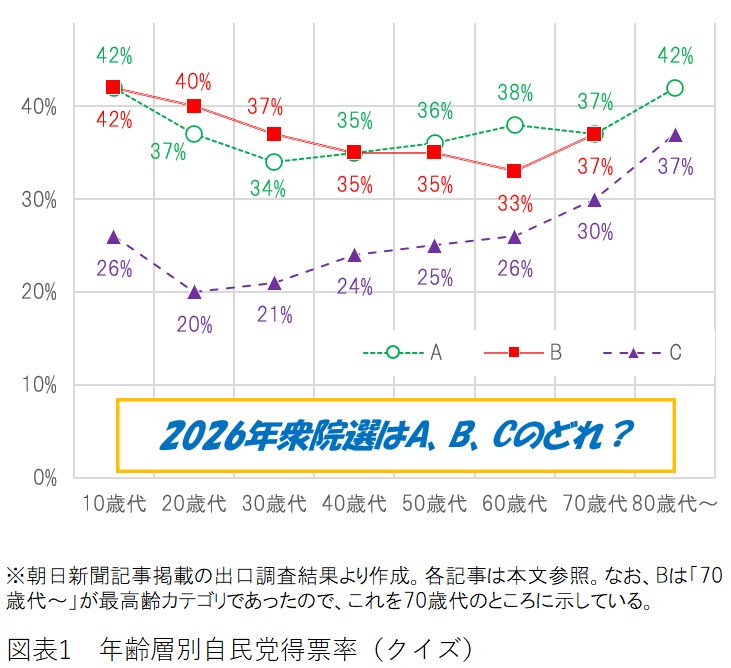 ところで、図表1は朝日新聞に掲載された出口調査における年齢層別の比例区自民党得票率を示しています※1)。