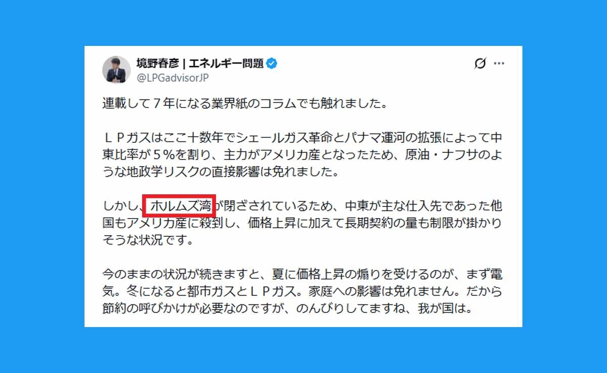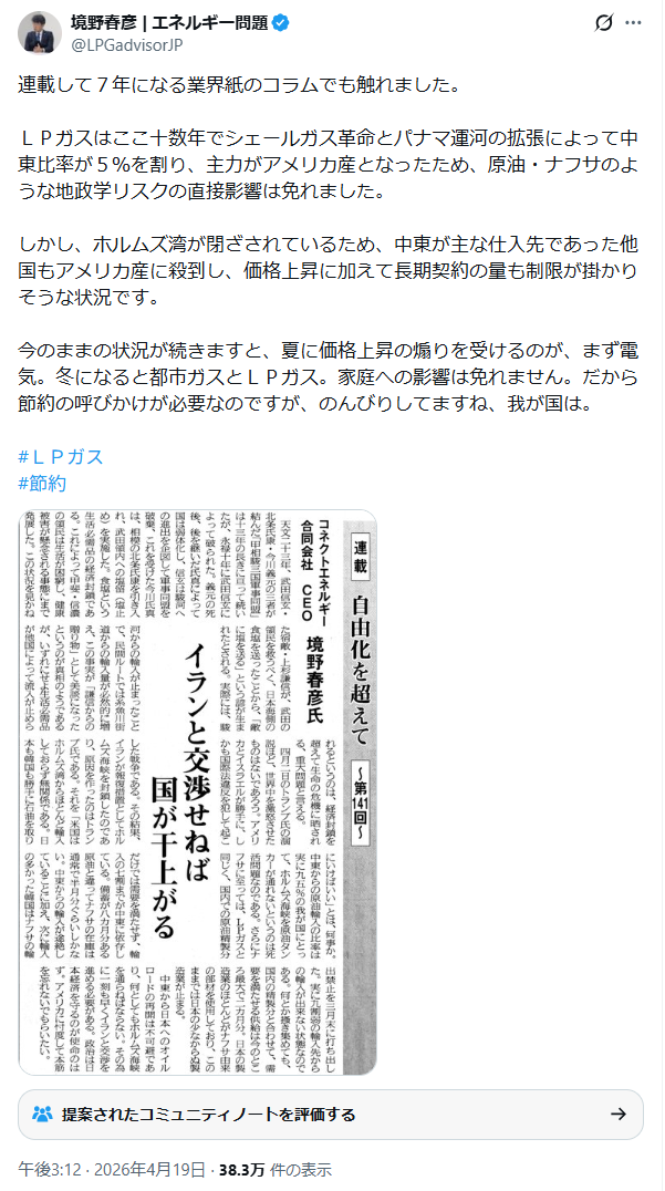 — 境野春彦 | エネルギー問題 (@LPGadvisorJP) April 19, 2026