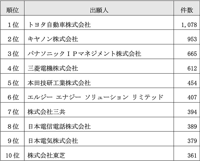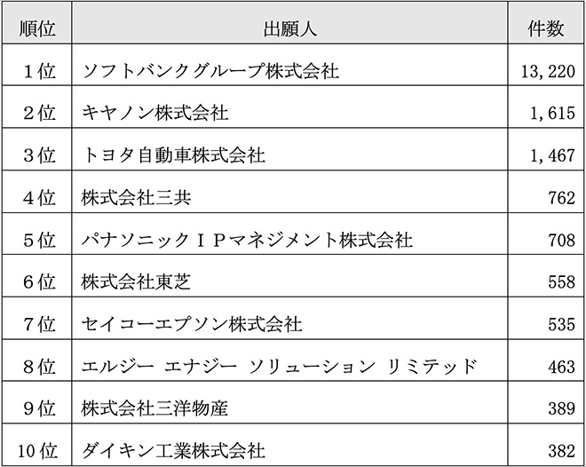 表1 特許出願件数ランキング(2026年出願分)