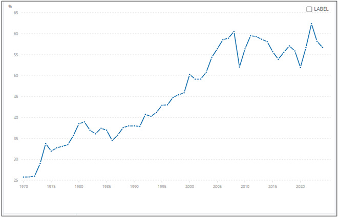 図2 世界貿易額の世界GDPとの比率(1970-2024年)