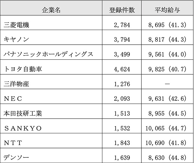 表1は特許の出願件数、表2は特許の取得件数、表3は特許登録件数と平均給与を示している。これらの数字と特許からどのくらいの収入があるか、特許にどれだけの価値があるかは別問題だが、両者に一定の相関関係はあるように見える。