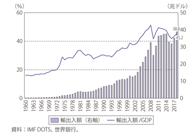 図1 世界の貿易額とGDPに占める割合の推移