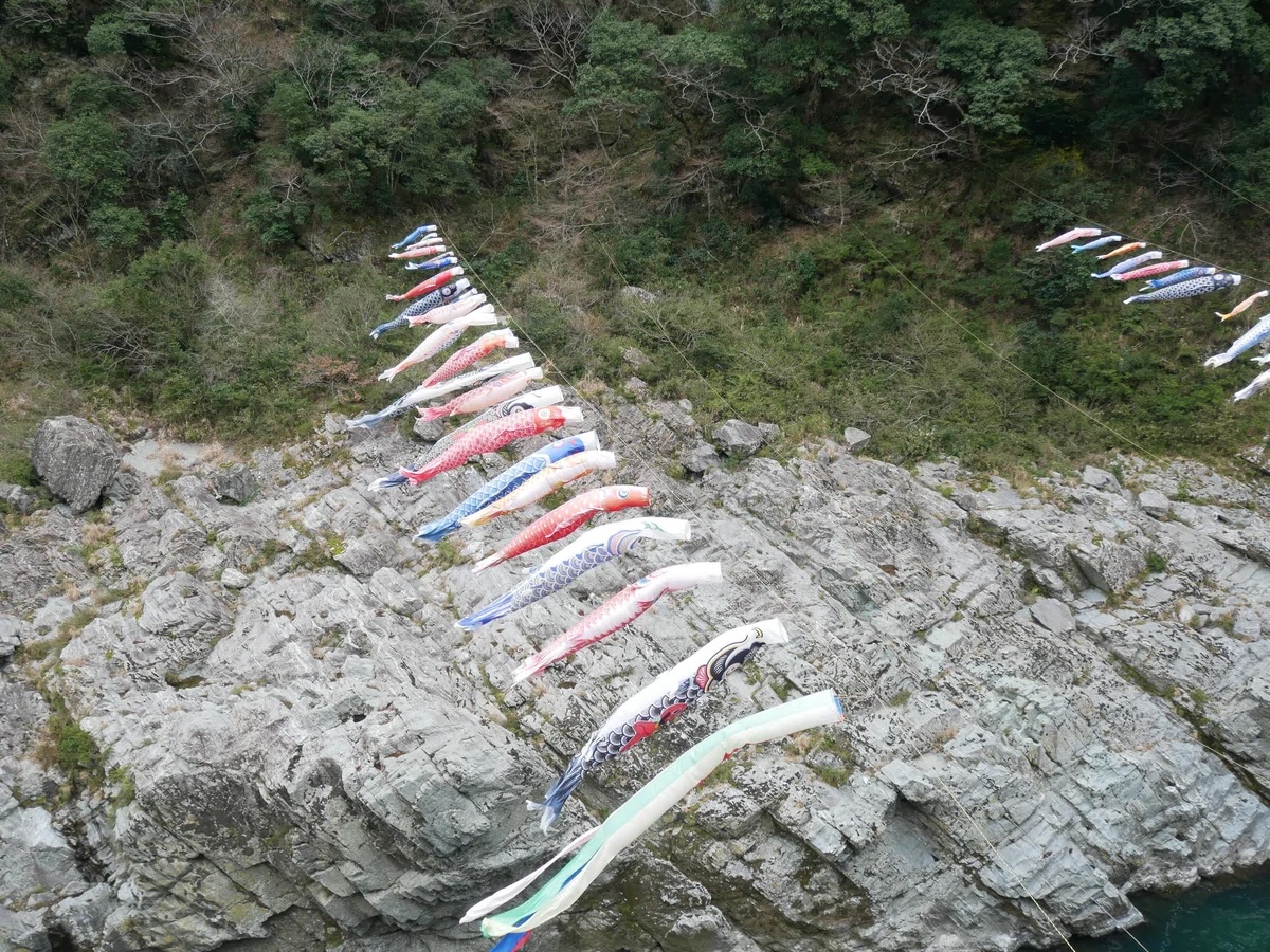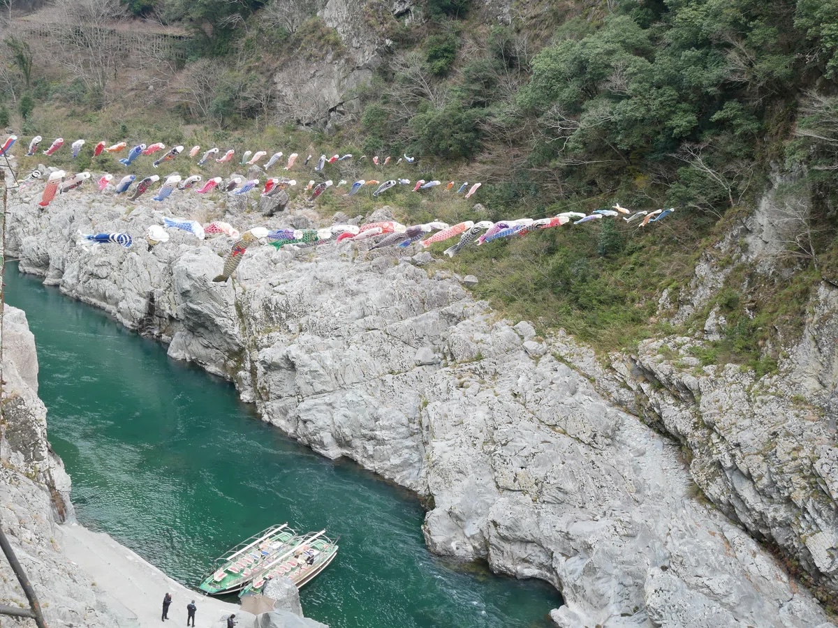 大歩危峡の断崖絶壁に鯉のぼりが渡されていました。これだけの峡谷に鯉のぼりを掲げるのは大変な作業だったのではないかと思います。大歩危峡の春の風物詩です。