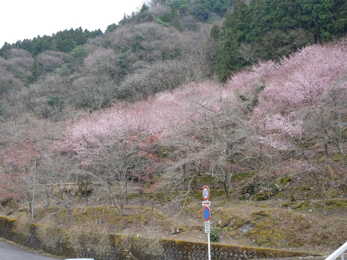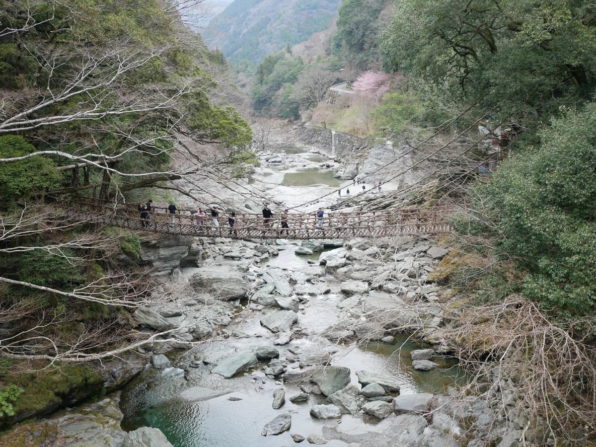かつて棚田だった場所は石垣が残りその面影を残しています。その上部では桜が咲き始め、山里にも春が来たことを告げていました。そんな棚田の跡を横目に見ながら、祖谷渓きっての観光名所「祖谷のかずら橋」に歩いていきます。