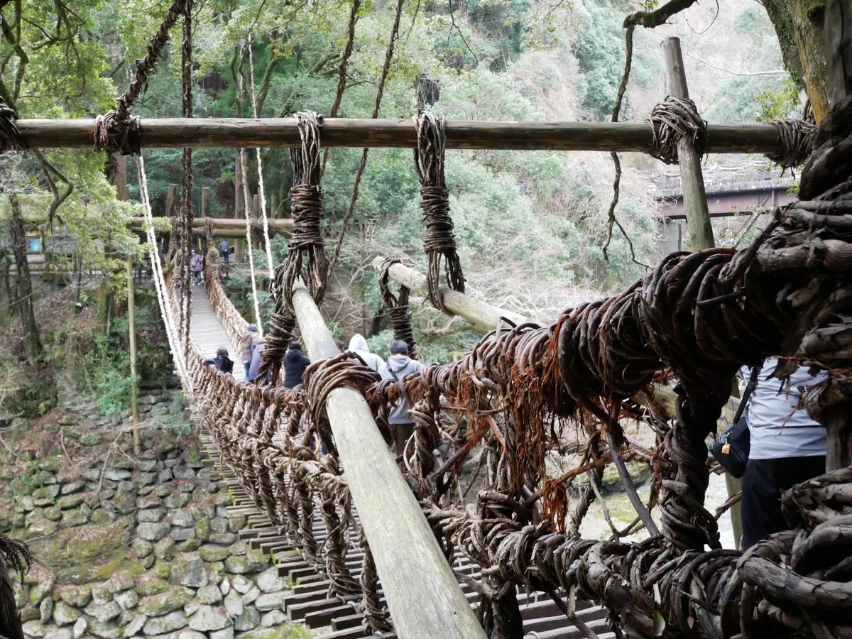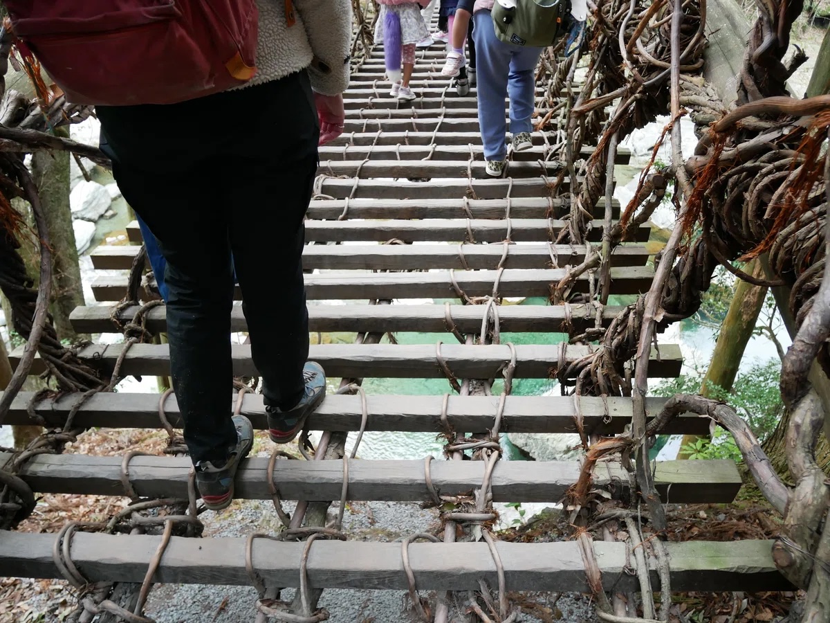 550円の入場料を払って、かずら橋を渡ります。この緊張感は静岡県の大井川に架かる吊り橋を渡るとき以来。足場となる木の板は隙間が結構空いていて、足を踏み外さないか不安になりますし、他の人が渡る振動でゆらゆらと揺れてスリルを感じます。