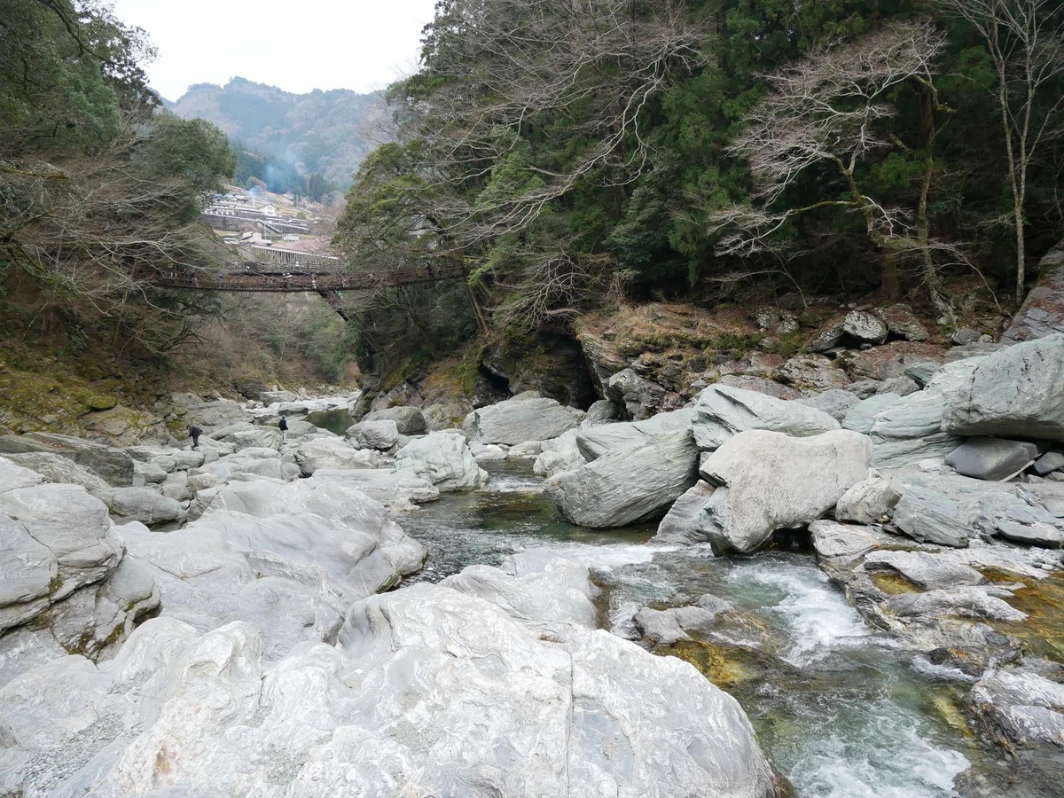無事橋を渡り終え、川に降りてみます。川から望むと改めてかずら橋、意外と高いところを渡っていたんだということを実感します。水面上14mだそうです。