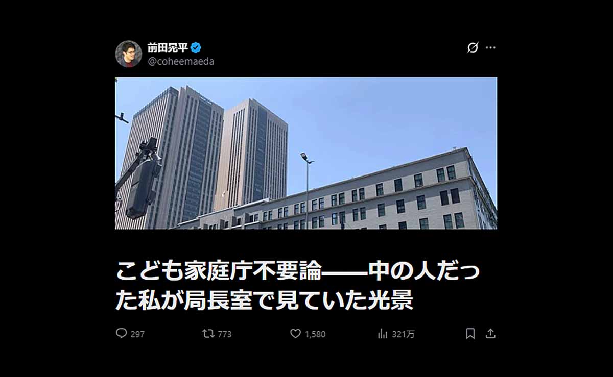 認定NPO法人フローレンス出身の前田晃平氏がXに投稿した子ども家庭庁の存在意義を擁護する記事をきっかけに、こども家庭庁をめぐる不要論が再び強まっている。こども家庭庁の存在意義だけにとどまらず、特定のNPOと行政の関係性そのものへの疑問が噴出している状況だ。