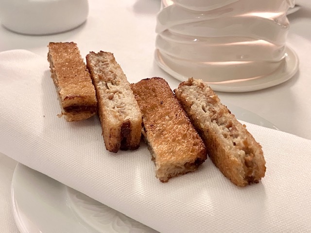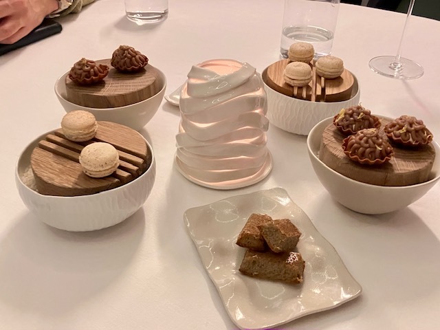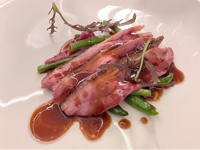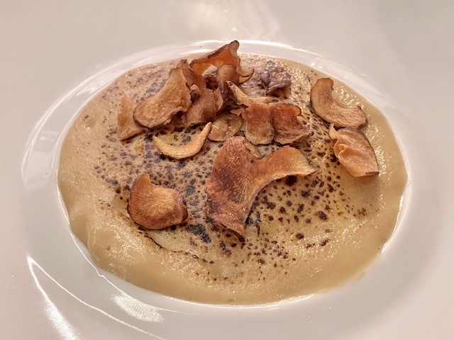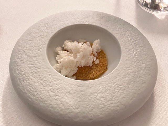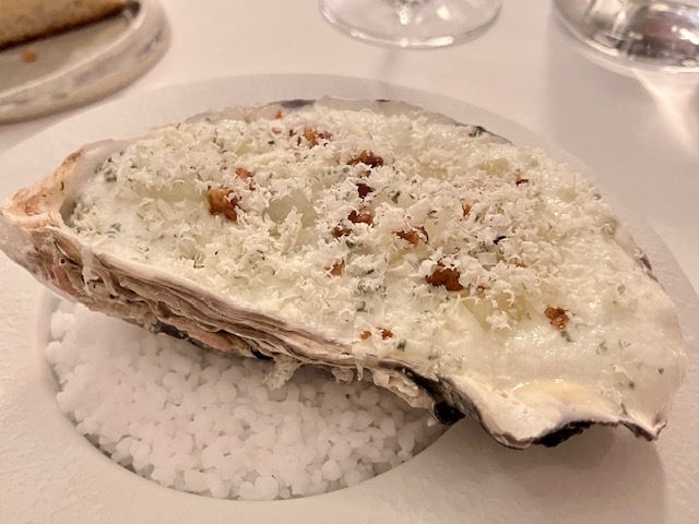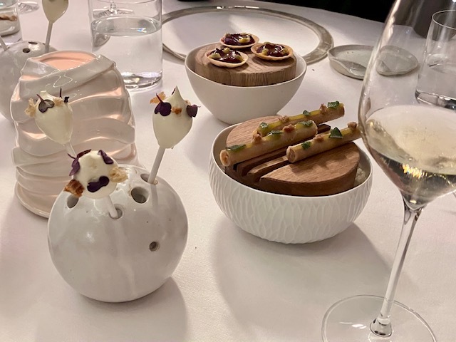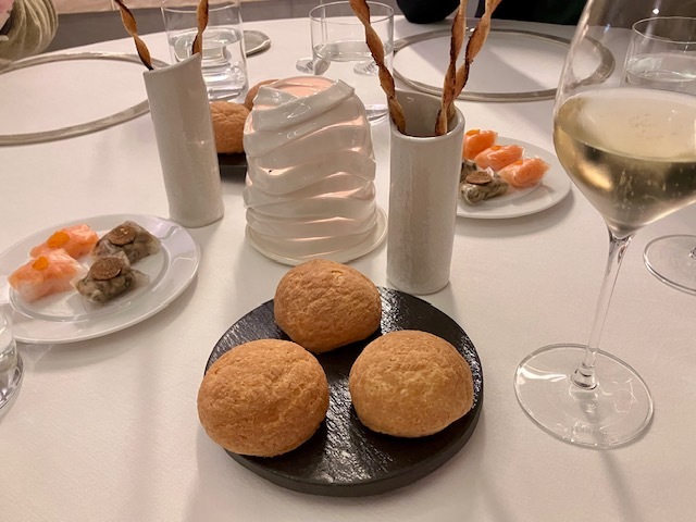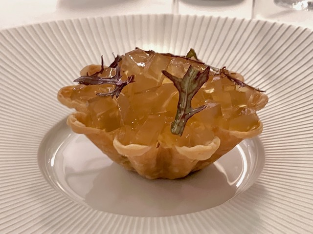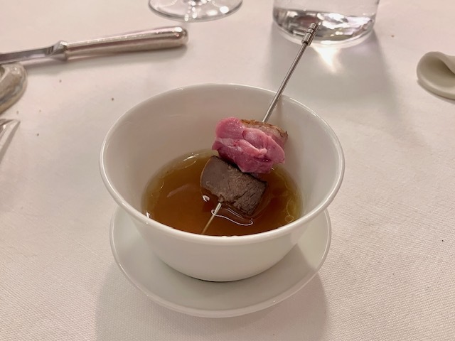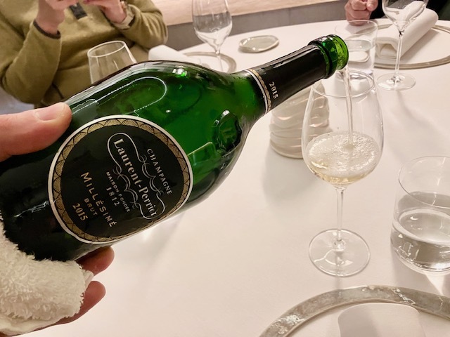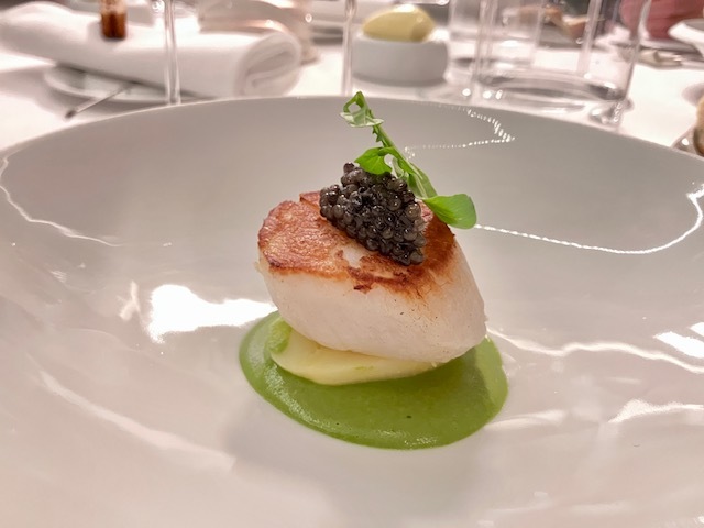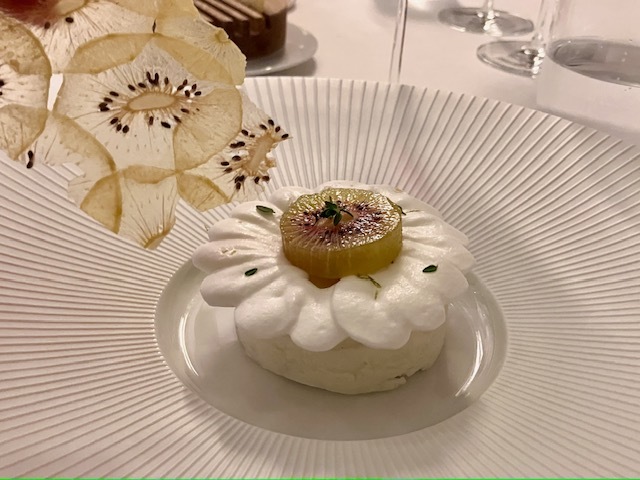 10年前に仕込まれたシャンパーニュで乾杯し、牡蠣、世にも美しく繊細なパテ・クルート、2月に絶賛したトピナンブール。ホタテ&クレソン&カヴィア、鴨。デセールは、キウイ&メレンゲ。