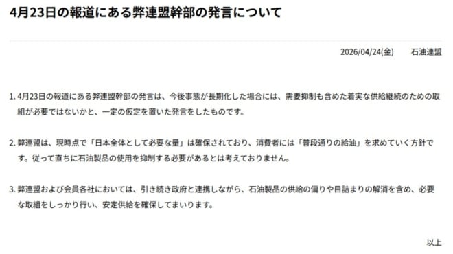 これに対して経産省が注文をつけ、石油連盟は発言を訂正した。これは高市首相の「従来通り使ってよい」とのメッセージを優先した「口止めではないか」との見方が出ている。