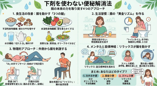 薬に頼らず、身体が本来持っている「出す力」を取り戻すには、日々の生活習慣を多角的に整えることが不可欠です。本記事では、食事、習慣、運動、精神面の4つのアプローチから、下剤を使わない便秘改善メソッドを徹底解説します。