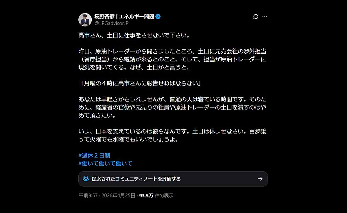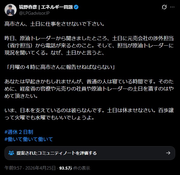 高市さん、土日に仕事をさせないで下さい。昨日、原油トレーダーから聞きましたところ、土日に元売会社の渉外担当(省庁担当)から電話が来るとのこと。そして、担当が原油トレーダーに現況を聞いてくる。なぜ、土日かと言うと、