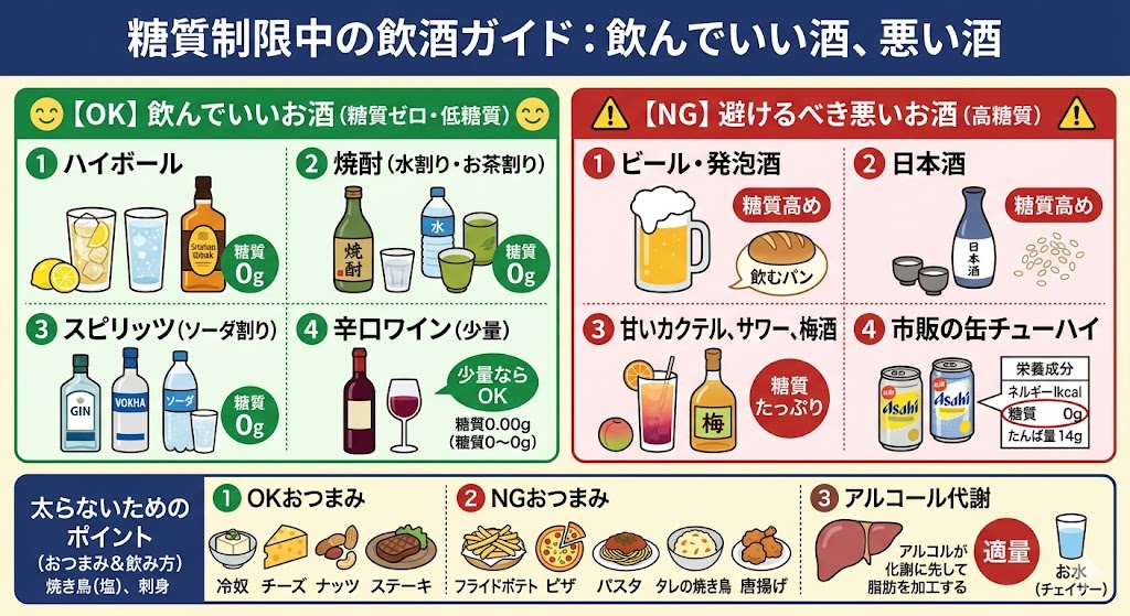 糖質制限中の飲酒は、「蒸留酒(ハイボールや焼酎)を無糖で割って飲む」のが最大の鉄則です。ビールや日本酒、甘いカクテルは日常的には避け、おつまみも糖質の少ない肉や魚、大豆製品を合わせることで、糖質摂取量をぐっと抑えられます。